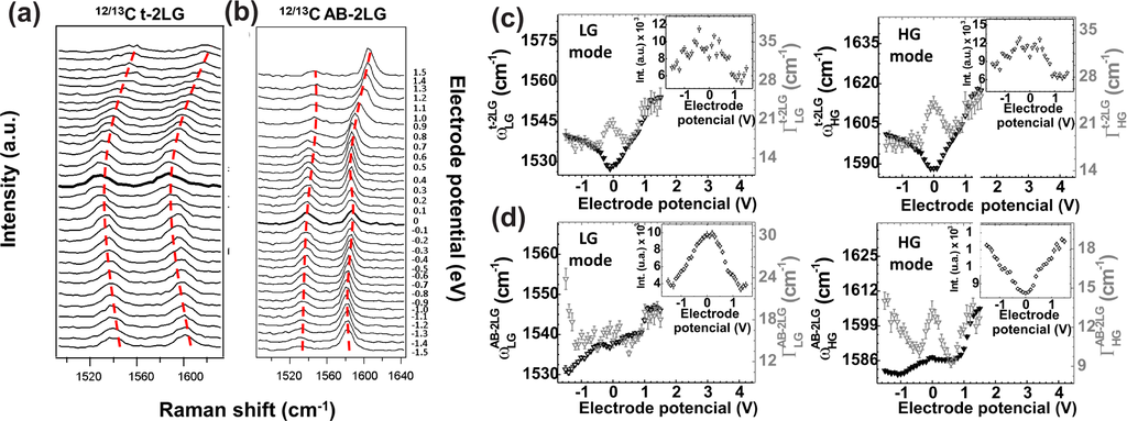 The bandgap opening, in fact, reflects spectral changes in the positive electrochemical potential values in the LG (or G−) modes due to the applied gate potential, as shown in Figure 18d. In Figure 18c, which shows the data for the 12/13C t-2LG, the frequency hardening followed by a saturation at around −1 V for the LG and HG modes is evident and means that the phonon self-energy renormalization is taking place and is a major effect between −1 V and 0 and from −1 V on, the doping-related changes in the C–C bonds, which decrease the phonon frequency, is a major effect. No band gap is introduced since the 2LG in question is turbostratic. Now, as shown in Figure 18d, the LG (or G−) and HG (or G+) frequencies decrease for the 12/13C AB-2LG, which means that the changes in the C–C bonds are the major changes, as explained above. For negative electrochemical potentials, in which electrons are being injected to the system, EF will be in the conduction band before the condition Eph < Egap occurs [20]. This means that the band gap will not play an important rule for negative potentials. For the range from 0 to +1 V, the frequency is roughly constant for the HG (or G+) mode in Figure 18d and slightly increases for the LG (or G−) mode. This suggests that the bandgap is likely affecting the LG (or G−) mode which is halting the phonon renormalization, since when EF decreases, the electrons supposedly going from the π1 band to the π1* band will eventually fall into the band gap. During the time this happens, the C–C bond changes will be the major effect in the frequency changes. Additionally, we believe that the inhomogeneous charging of the top and bottom layers in AB-2LG could explain why the band gap almost does not affect the HG (or G+) mode [80]. Finally, at high positive potentials above 1 V, the explanations given above are enough to explain the frequency changes since the gap will not affect the system anymore. Moreover, since the t-2LG system does not open a band gap, its frequency behavior with the electrochemical potential is totally explained within the phonon self-energy formalism and together with C–C bond changes.