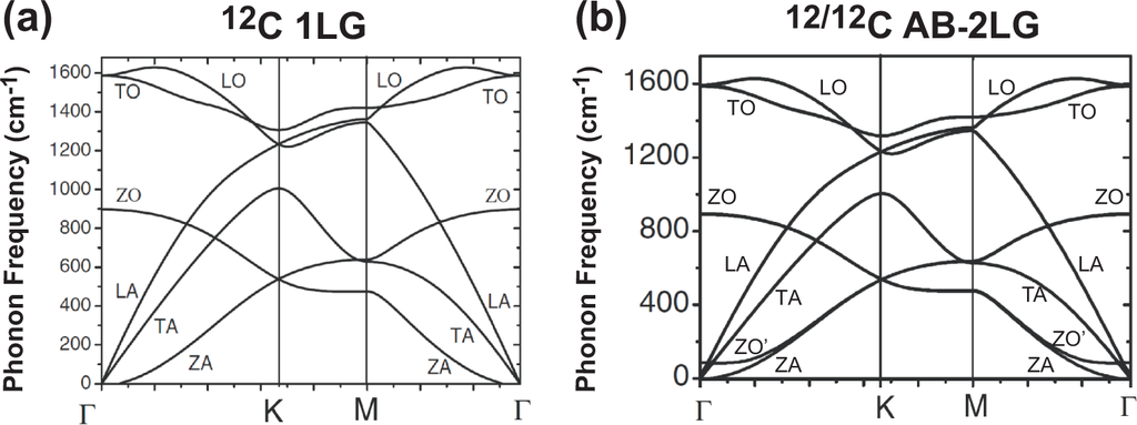 Since 1LG has two carbon atoms per unit cell, its vibrational structure is composed of six phonon branches, three of them optical (one in-plane longitudinal mode-LO, one in-plane transverse mode-TO and one out-of-plane transverse mode-ZO) and three of them acoustic (one in-plane longitudinal mode-LA, one-in plane transverse mode-TA and one out-of-plane transverse mode-ZA). The LO and TO modes are degenerated at the Γ point and give rise to the famous G band and the TO mode at the K point gives rise to the G′ band. Figure 2a shows the phonon dispersion for 1LG [33,34] and Figure 3 shows the Raman spectra for both (a) 12C and (b) 13C 1LG.