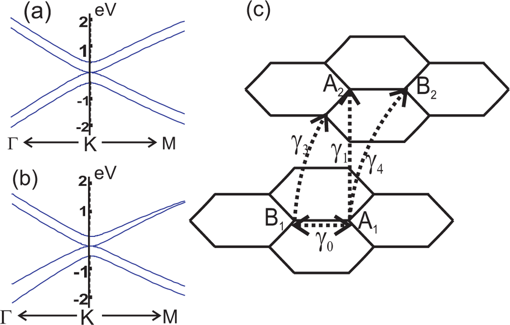 Electronic structure of 2LG around the K point using (a) γ3 and γ4 equal to zero and (b) γ3 = 0.3 eV and γ4 = 0.15 eV [40]; (c)The intra- (γ0) and inter-layer (γ1, γ3 and γ4) tight-binding hoping parameters in 2LG.
