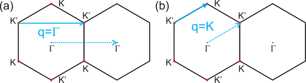 The two possible vector (a) q = Γ and (b) q = K that can connect two electronic states in the Fermi surface (red dots) in graphene.