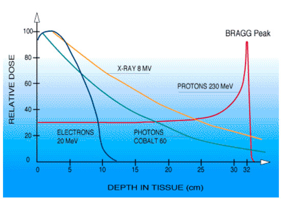 Proton and heavy ion therapy are important and efficient sources of therapeutic irradiation on account of the capability for dose localization. Figure 1 illustrates the well-known relative dose of therapeutic irradiation beams as a function of depth in tissue.