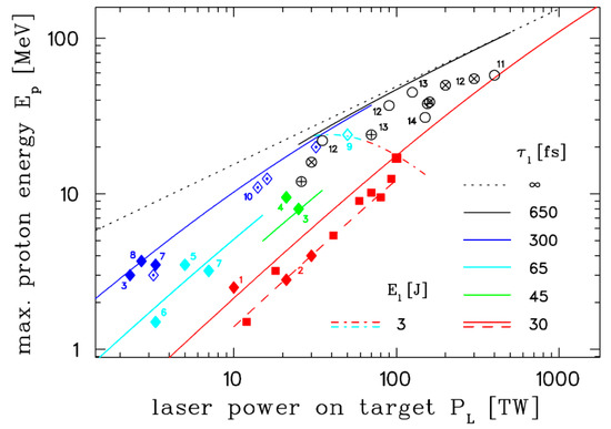 Energy scaling of the accelerated protons as a function of the laser power on target, as well as pulse width. The many different contributions from various authors are given in [34]. Reproduced from [34]. Copyright 2010, IOPscience.