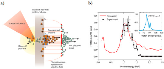 (a) A laser incident on a proton dot deposited on a titanium substrate; (b) Experimental peaked proton spectrum (black dots) and PIC (particle in cell) simulation (red curve). Reproduced from [51]. Copyright 2006, Macmillan Publishers. For other examples see [52].
