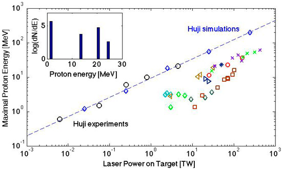 Schwoerer and his team produced quasi-monoenergetic protons by irradiating microstructured targets, an idea that had been suggested by Esirkepov et al. in 2002, [50]. The authors pointed out that the resulting proton spectrum has a strong correlation to the spatial distribution of the protons on the target surface as shown in Figure 9a. A terawatt (TW) laser beam is focused on the front side of a metal target generating electrons, which establish a Debye sheath on the back surface as described earlier. Applying a small hydrogen-rich dot (a polymethyl methacrylate, PMMA dot was used) on the back surface enhances the proton yield in the central part of the accelerating field, which is more homogeneous. This produces a noticeable peak in the proton spectrum as shown in Figure 9b. The figure also includes particle in cell (PIC) simulation results for the laser and target conditions used in the experiment. An inset in the figure estimates the anticipated proton spectrum at a laser intensity of 1021 W·cm−2.