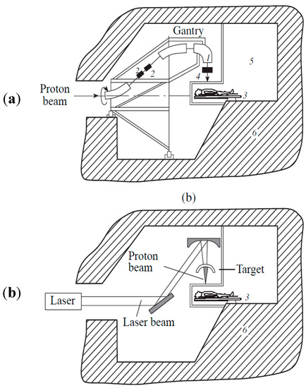 (a) Conventional gantry system to direct the ion beam to the patient. This can normally be about 100 tons in weight and very expensive; (b) The design of an optical (laser) gantry system which uses mirrors to convey the beam closer to the patient. Reproduced from [68]. Copyright 2002, MAIK “Nauka/Interperiodica”.
