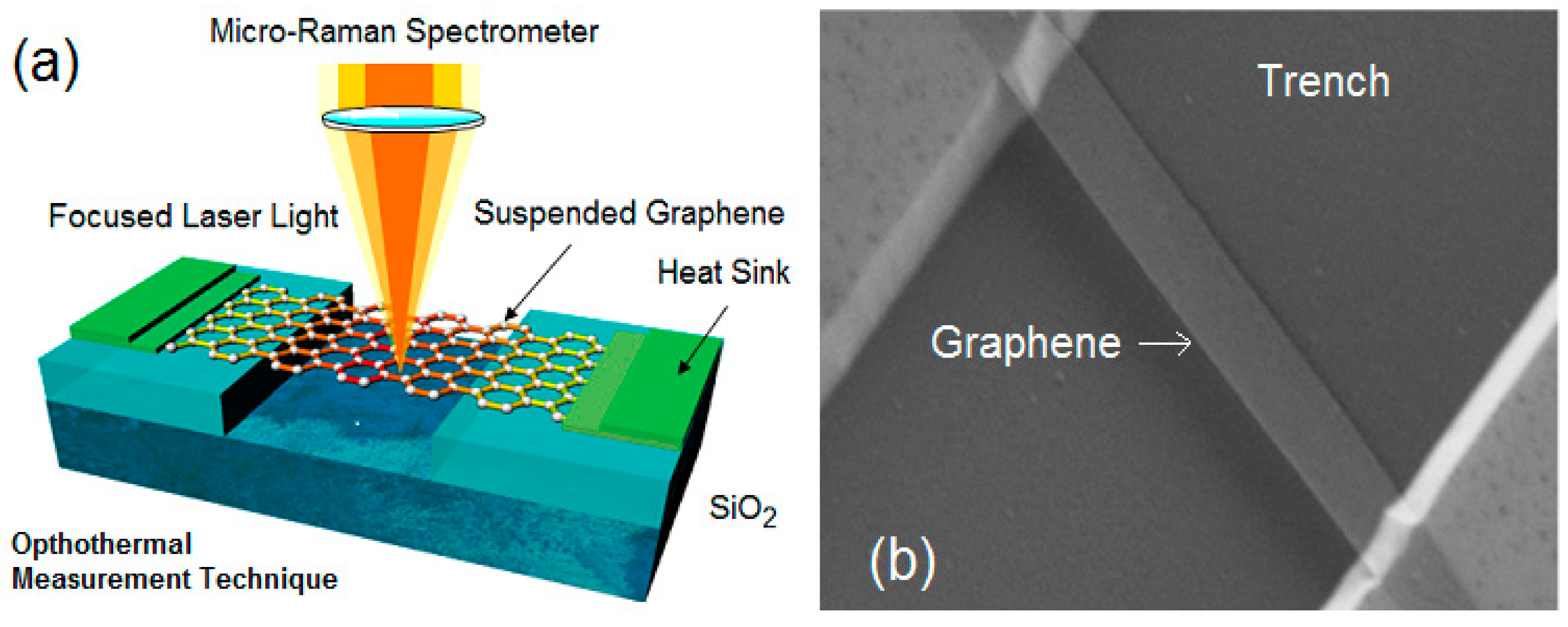 (a) Schematic of the suspended graphene structure used for measurements of the thermal conductivity of graphene. Graphene was heated with the laser light focused in the middle of the suspended part. The temperature rise was determined from the shift of the G peak position in graphene Raman spectrum; (b) Scanning electron image of the bilayer graphene ribbon suspended across the 3-μm trench in Si/SiO2 wafer for optothermal measurements. The image is reproduced with permission from [1]. Copyright 2010 Nature Publishing Group.