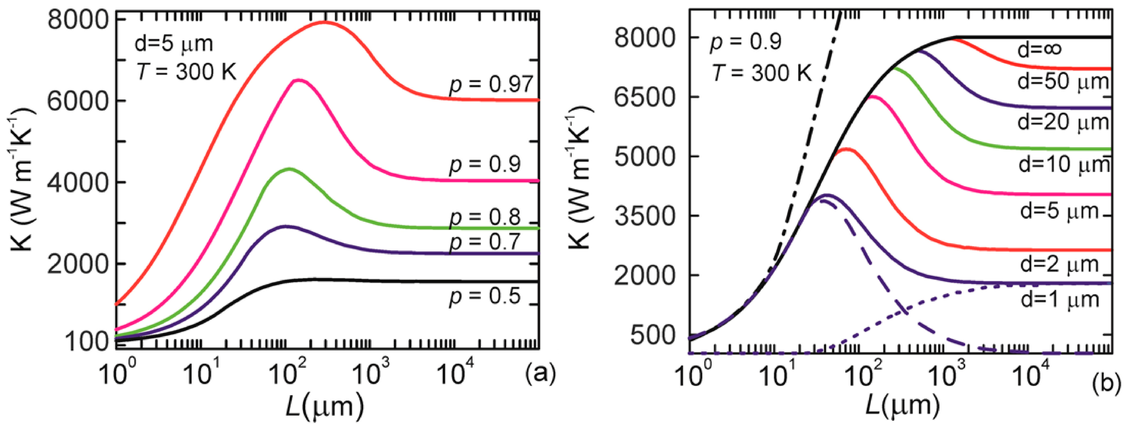 (a) Dependence of the thermal conductivity of the rectangular graphene ribbon on the ribbon length L shown for different specular parameters p. The ribbon width is fixed at d = 5 µm; (b) Dependence of the thermal conductivity of the rectangular graphene ribbon on the ribbon length L shown for different ribbon width d. The specular parameter is fixed at p = 0.9. Note in both panels an unusual non-monotonic length dependence of the thermal conductivity, which results from the exceptionally long phonon mean free path of the low-energy phonons and their angle-dependent scattering from the ribbon edge. Reprinted with permission from [43]. Copyright 2012 American Chemical Society.