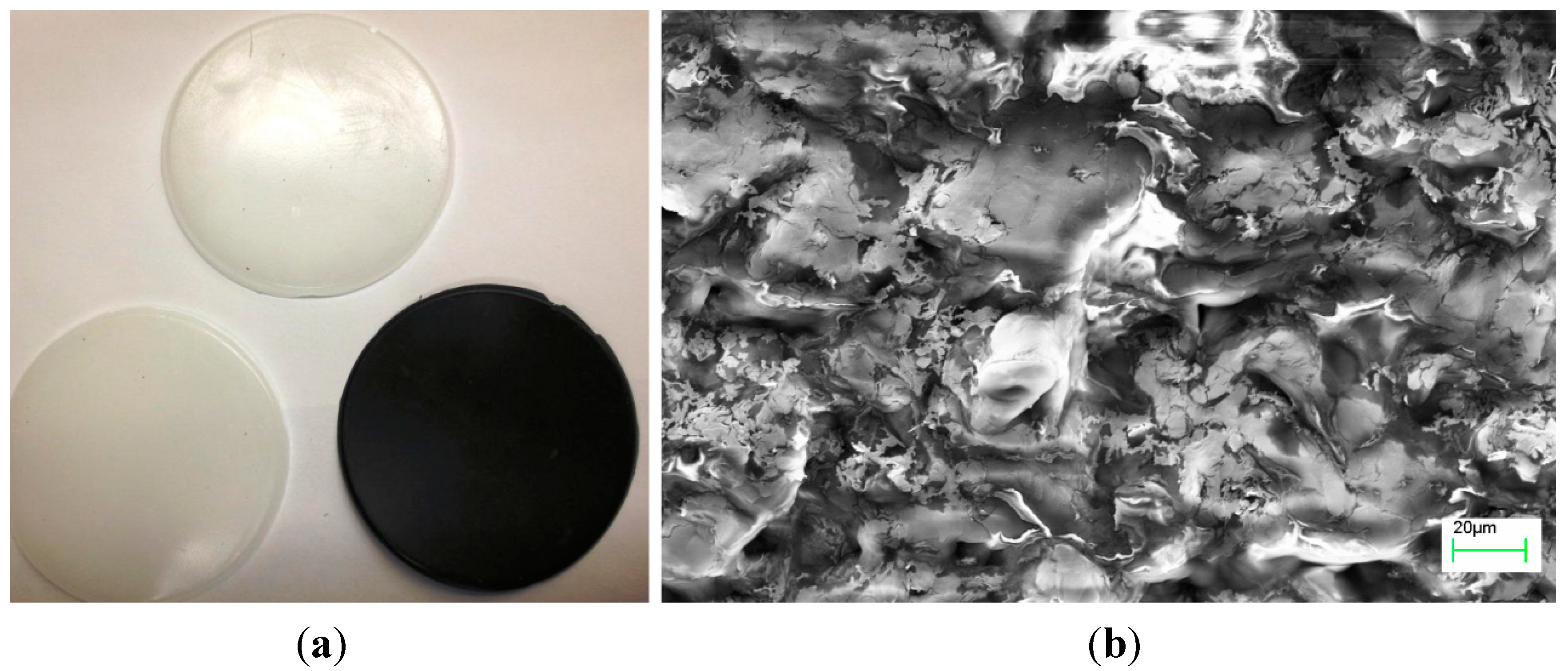 Hybrid graphene—paraffin phase change material. (a) Optical image of the PCM samples showing the change in color from white to black with increasing graphene content; (b) Scanning electron microscopy image of the hybrid graphene-PCM indicating uniform distribution of the graphene flakes.
