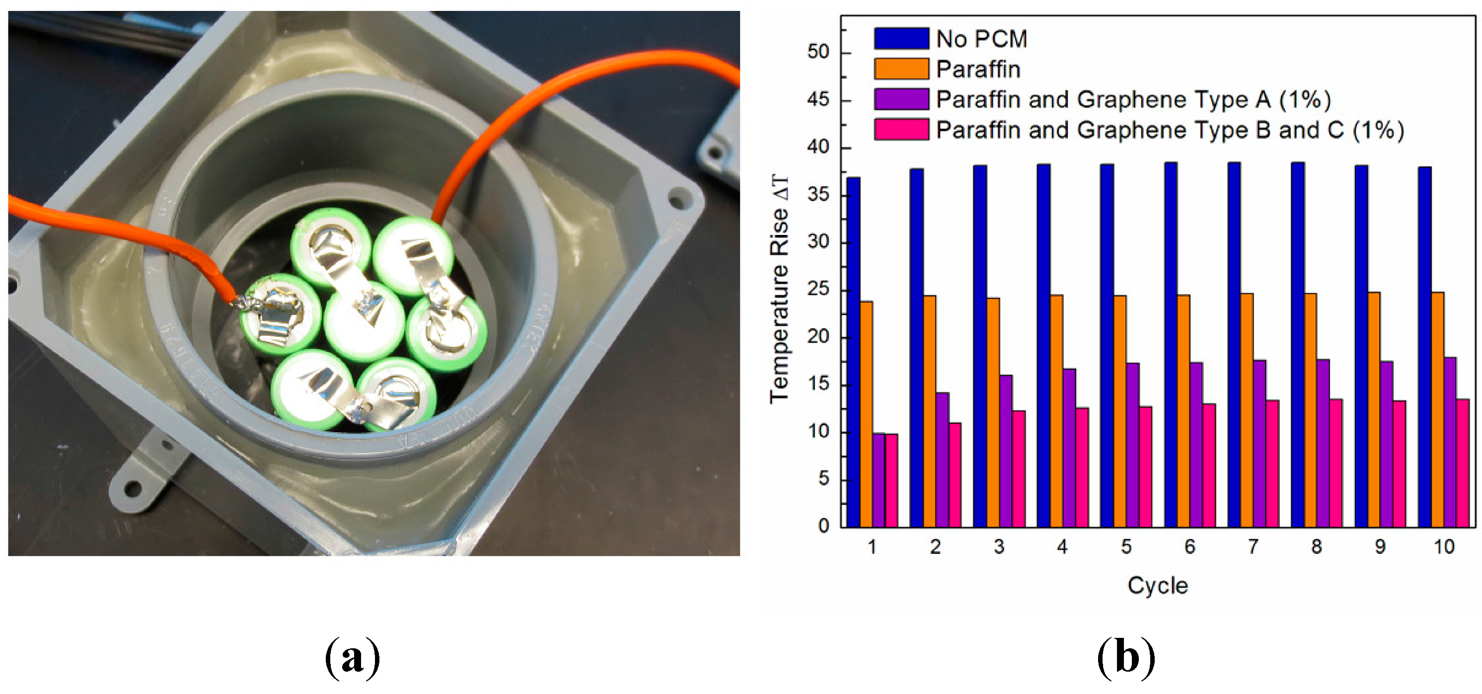 (a) Optical image of battery pack with six cylindrical Li-ion batteries. The space among the batteries is filled with paraffin PCM or graphene-enhanced PCM for testing under real-life conditions; (b) Diagram of the temperature rise inside the Li-ion battery pack during the first ten charging—discharging cycles for the battery pack without PCM (red), with conventional paraffin PCM (blue), with the hybrid graphene-PCM at 1 wt. % loading (orange) and with the hybrid graphene-PCM at 20 wt. % loading (green). Further reduction in the temperature rise is possible through a more robust design of the outside heat sink. The image in the right panel is reprinted with permission from [29]. Copyright 2014 Elsevier.