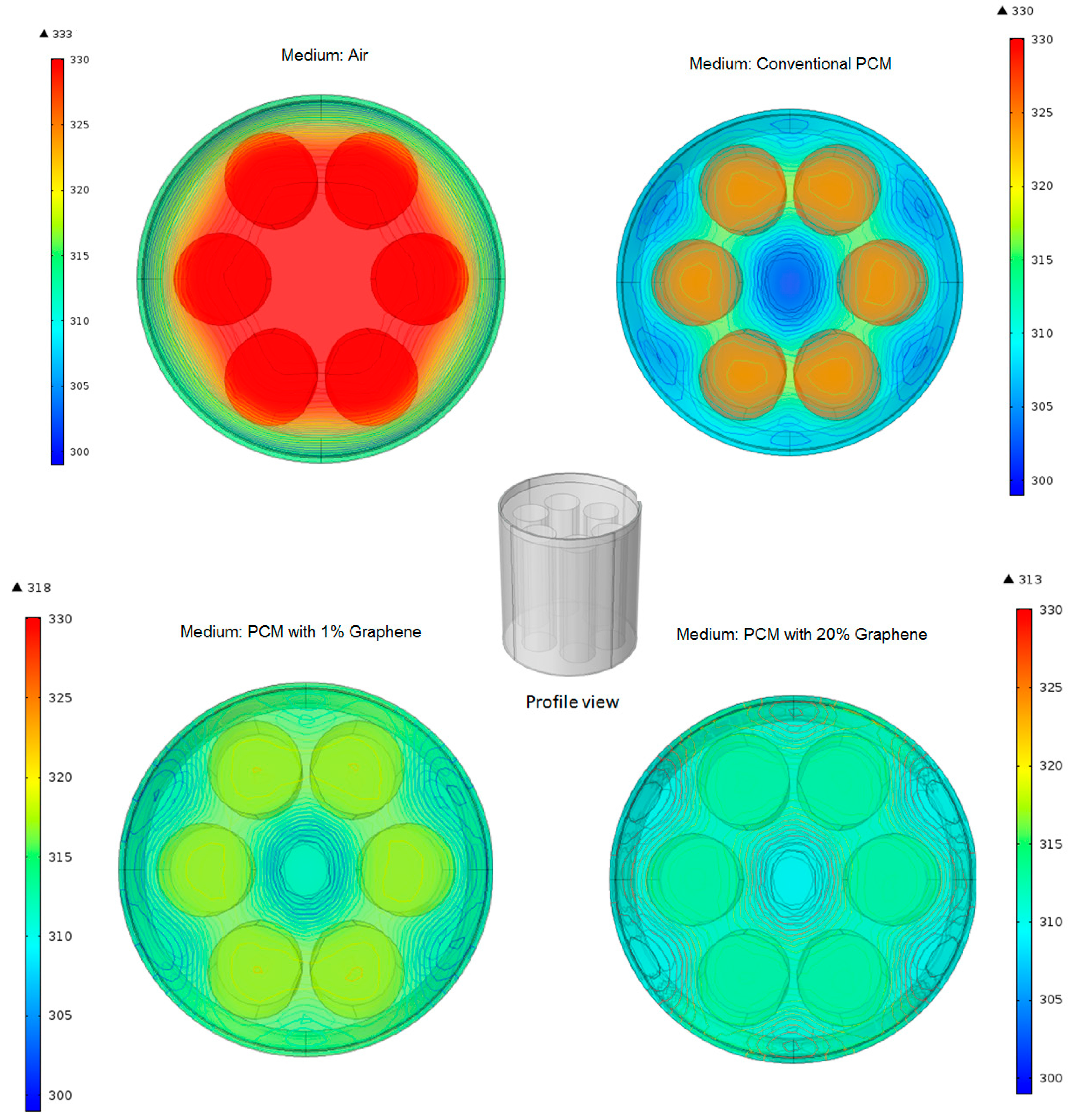 Figure 6 illustrates the Li-ion battery pack used in both empirical test setups and modeling simulations. Included are the simulated temperature profiles of four different cases that correspond to actual experimental setups. In the case of air (i.e., no PCM) serving as the medium between battery cylinders, the cylinders reach their maximum temperature at 333 K. Upon introduction of conventional paraffin PCM as the medium the maximum temperature of the cylinders drops to 320 K. However, the best performing thermal management of these battery cylinders comes from the use of hybrid graphene-PCM medium with maximum temperatures of 310–315 K resulting also in a more uniform temperature profile. One should note here that substantial reduction of the temperature of the battery cylinders is achieved even at small loading fractions of graphene.