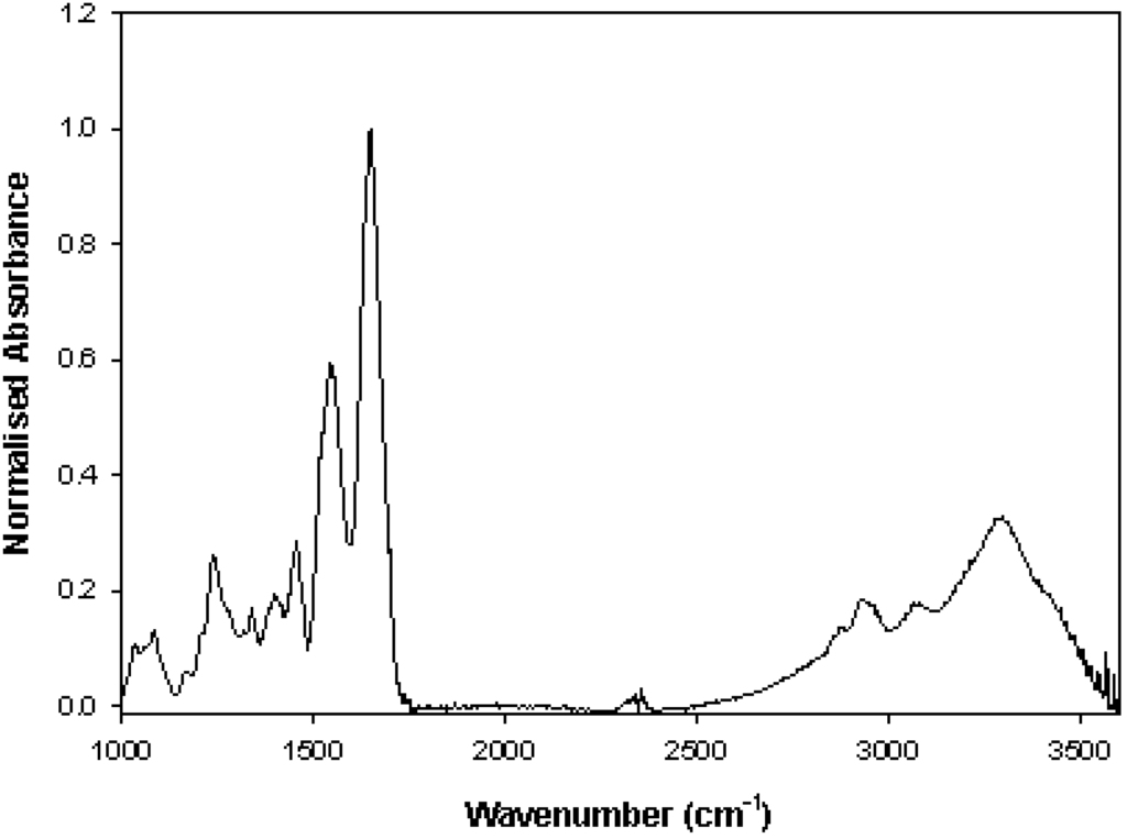A typical cellular FTIR spectrum is shown in Figure 2, together with a list of tentative spectral assignments in Table 1 []. The spectrum shown in Figure 2 can be divided into two regions, the high wavenumber region from 2500–4000 cm−1, corresponding to absorptions due to O-H, N-H, C-H stretching vibrations, and the fingerprint region from 900–1800 cm−1, which consists of many overlapping bands (see Table 1), and is characteristic of the sample.