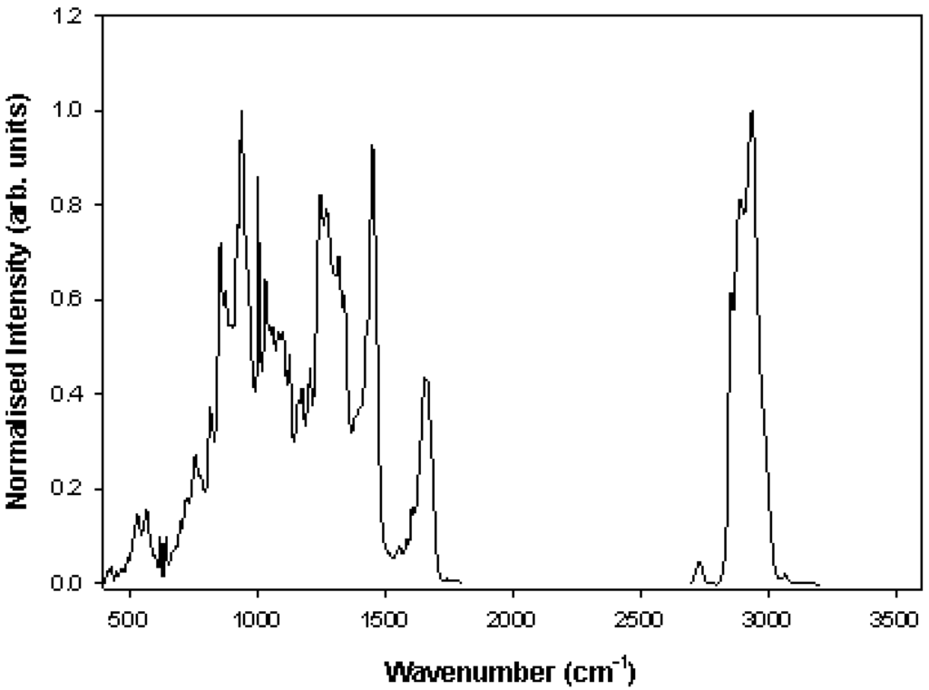 A typical cellular Raman spectrum is shown in Figure 3, together with a list of tentative spectral assignments in Table 2 []. As for Figure 2, the spectrum can be divided into two regions, the high wavenumber region, from 2500–3500 cm−1, and the fingerprint region, from 400–1800 cm−1.