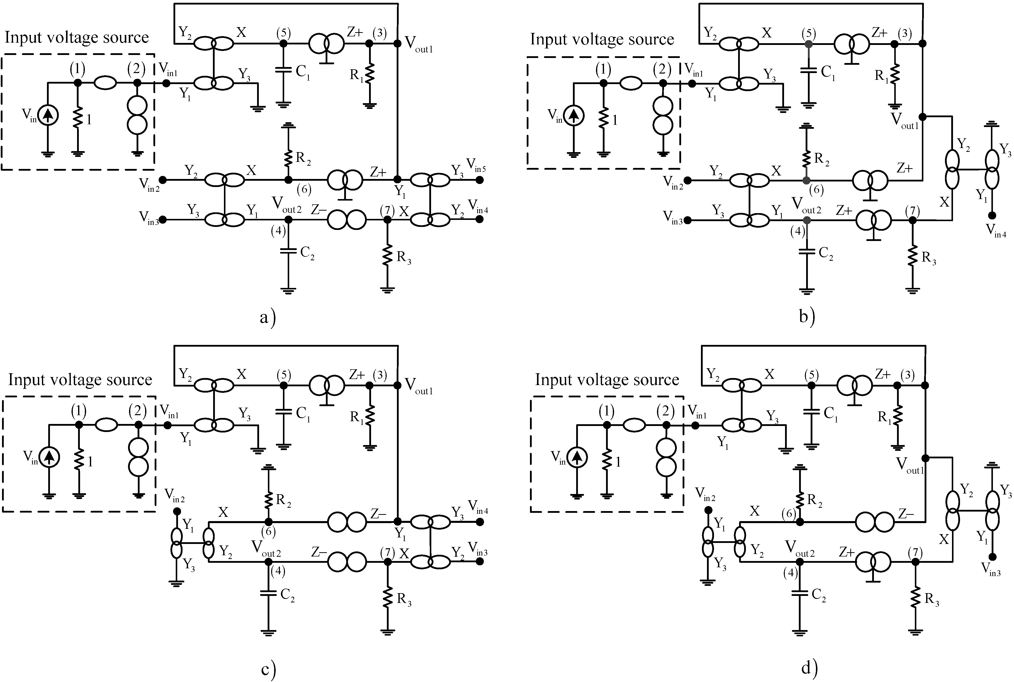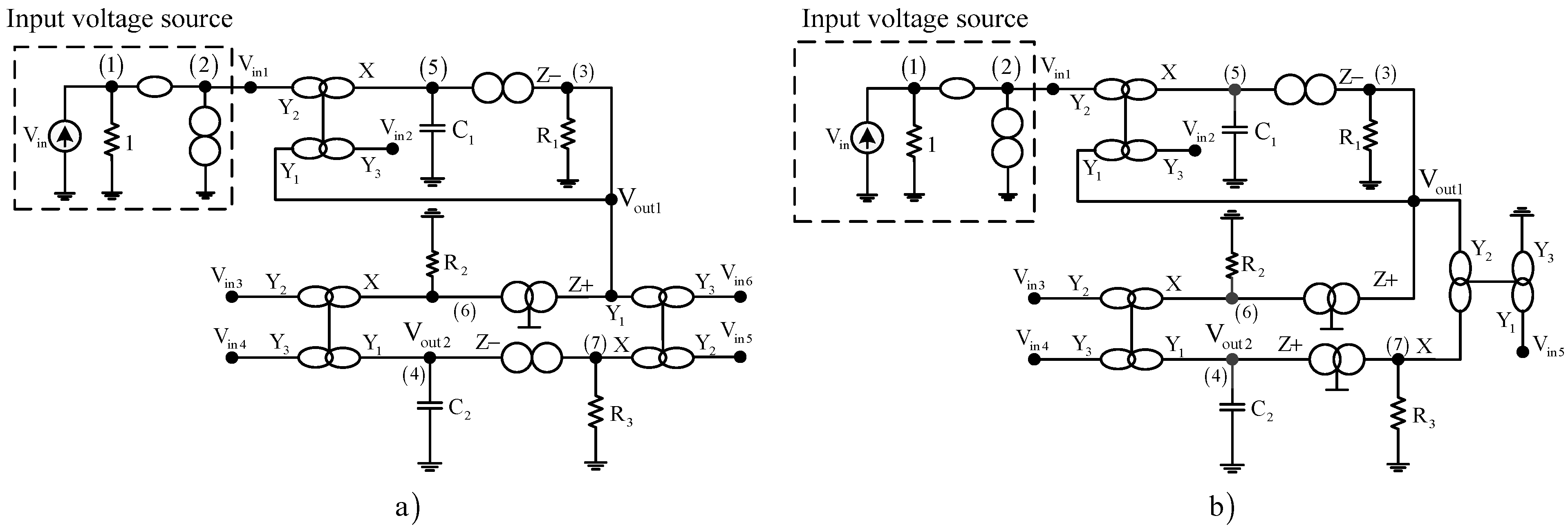 By applying the input voltage source to terminal-Y3 of DDCC(1), the term sC1 will be also created in position (2,1) of (12). Therefore, the admittance matrix is shown in (16) and the obtained transfer functions at nodes Vout1 and Vout2 are identical to that obtained in (15) but with reverse signs. The derived circuit is shown in Figure 3a with moving the injected voltage source equivalent circuit to node Vin2 and grounding nodes Vin1, Vin3, Vin4, Vin5 and Vin6.
