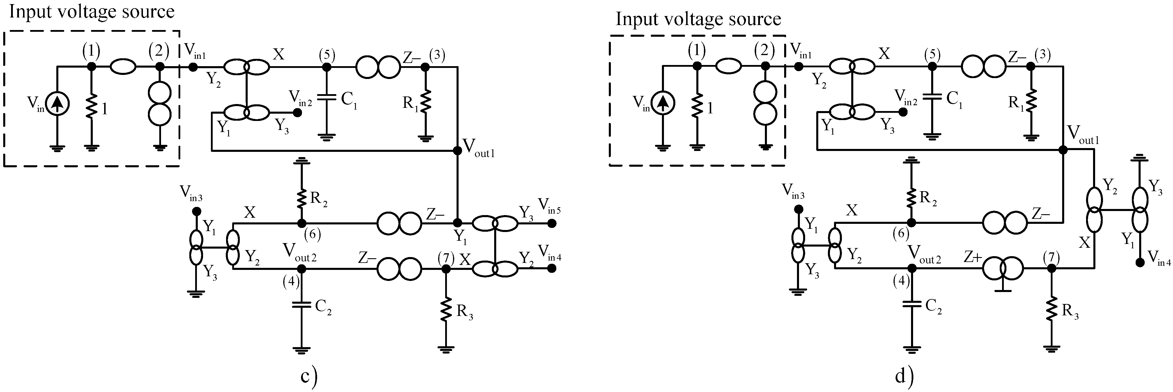 It can be observed that in the starting Matrix (5), the node 1 is chosen as input voltage node and other nodes can be output nodes. In (6), the node 1 and node 2 are connected by a nullator then they are equivalent to the input node, and other nodes can be output nodes. In Step 4, each pair of infinity-variables added to the second column of the obtained matrix in Step 3 corresponds to the injecting of input voltage signal to one Y-terminal of DDCCs. So, the circuits with high input impedance and multi-input and multi-output properties can therefore be synthesized.