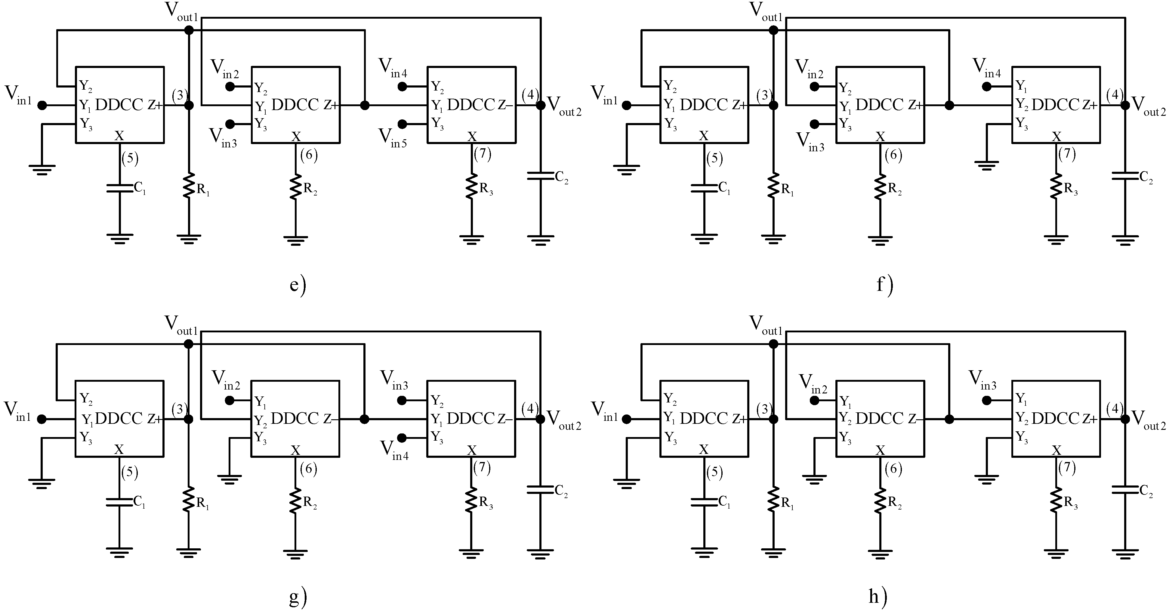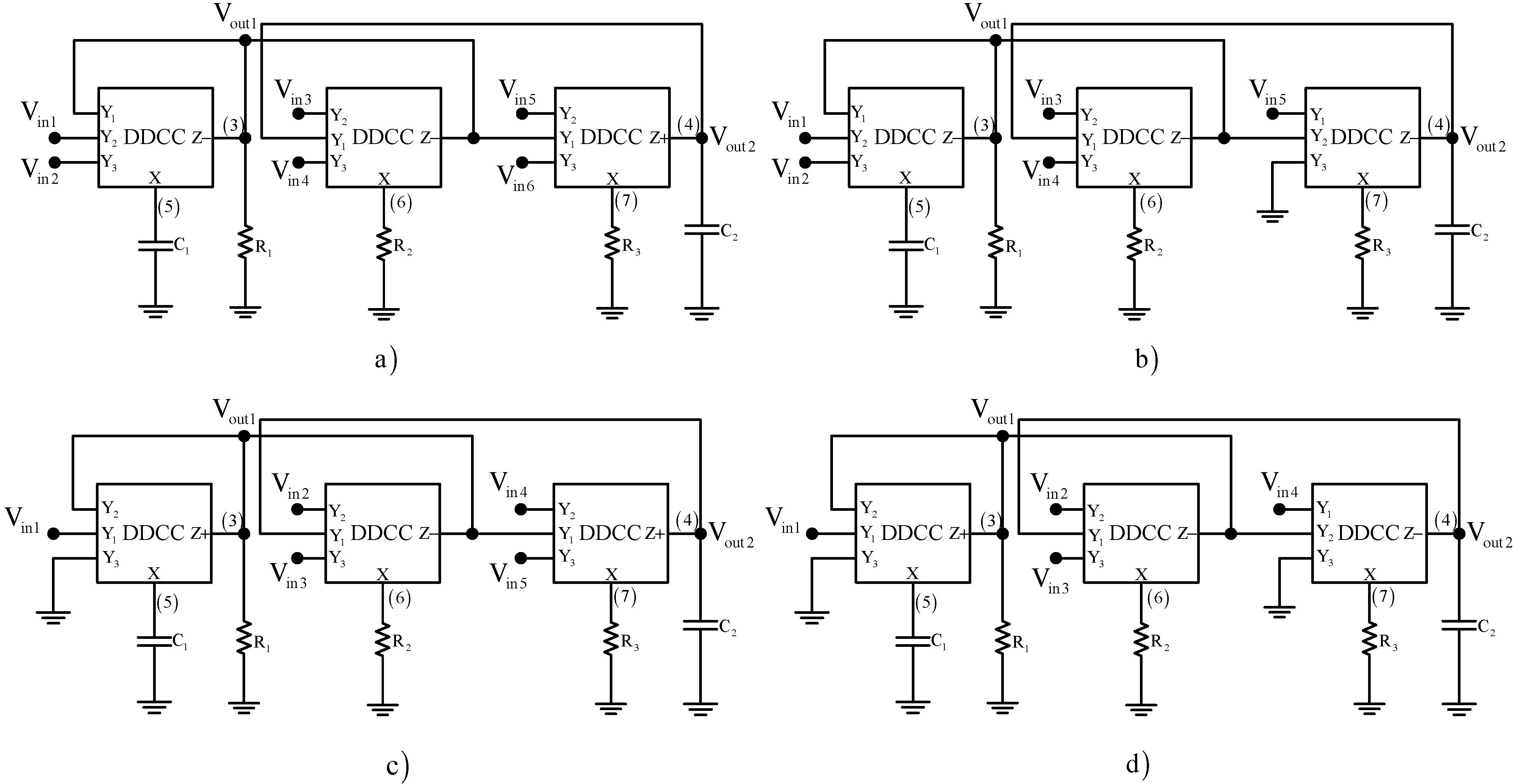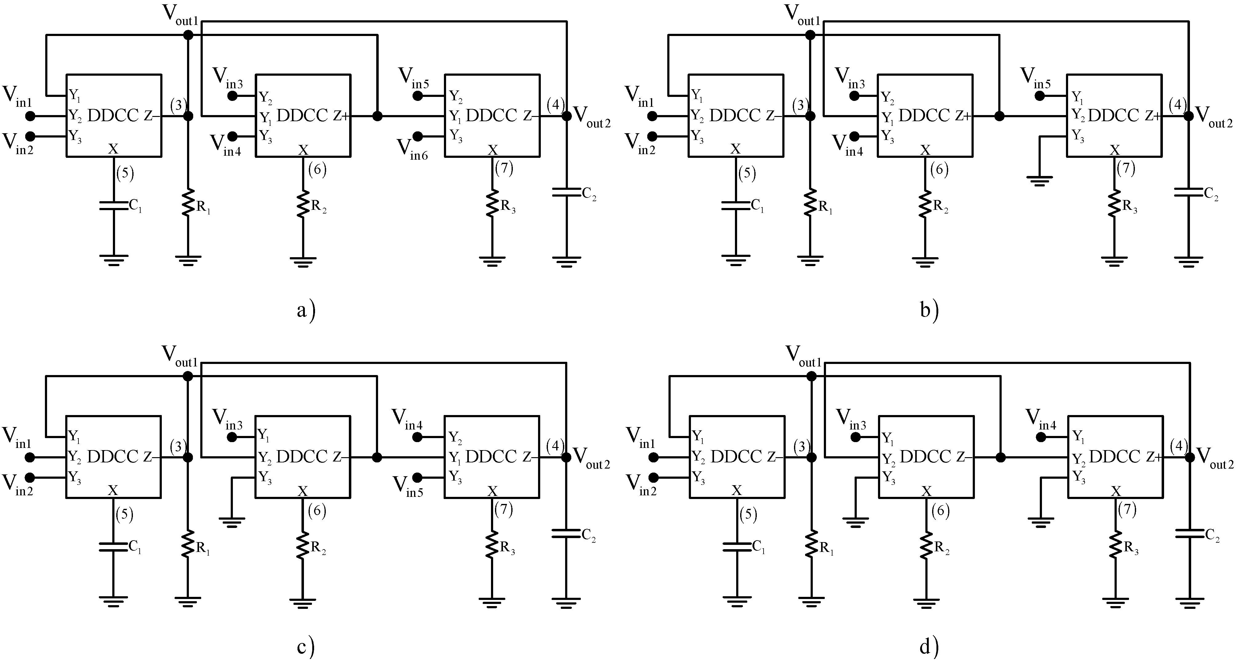 In (29), the DDCC(1), DDCC(2) and DDCC(3) are represented by terms ±∞2, ±∞3 and ±∞4, respectively. The terminal-X of DDCC(1) can be node 5, terminal-Y1 and terminal-Z (minus type) are connected to node 3. For the DDCC(2), terminal-X is connected to node 6, terminal-Y1 is connected to node 4 and terminal-Z (minus type) is connected to node 3. For the DDCC(3), the terminal-X is connected to node 7, terminal-Y1 is connected to node 3 and terminal-Z (plus type) is connected to node 4. All of the terminal-Y2 and terminal-Y3 of DDCC(1), DDCC(2) and DDCC(3) can be used to inject the input voltage source.
