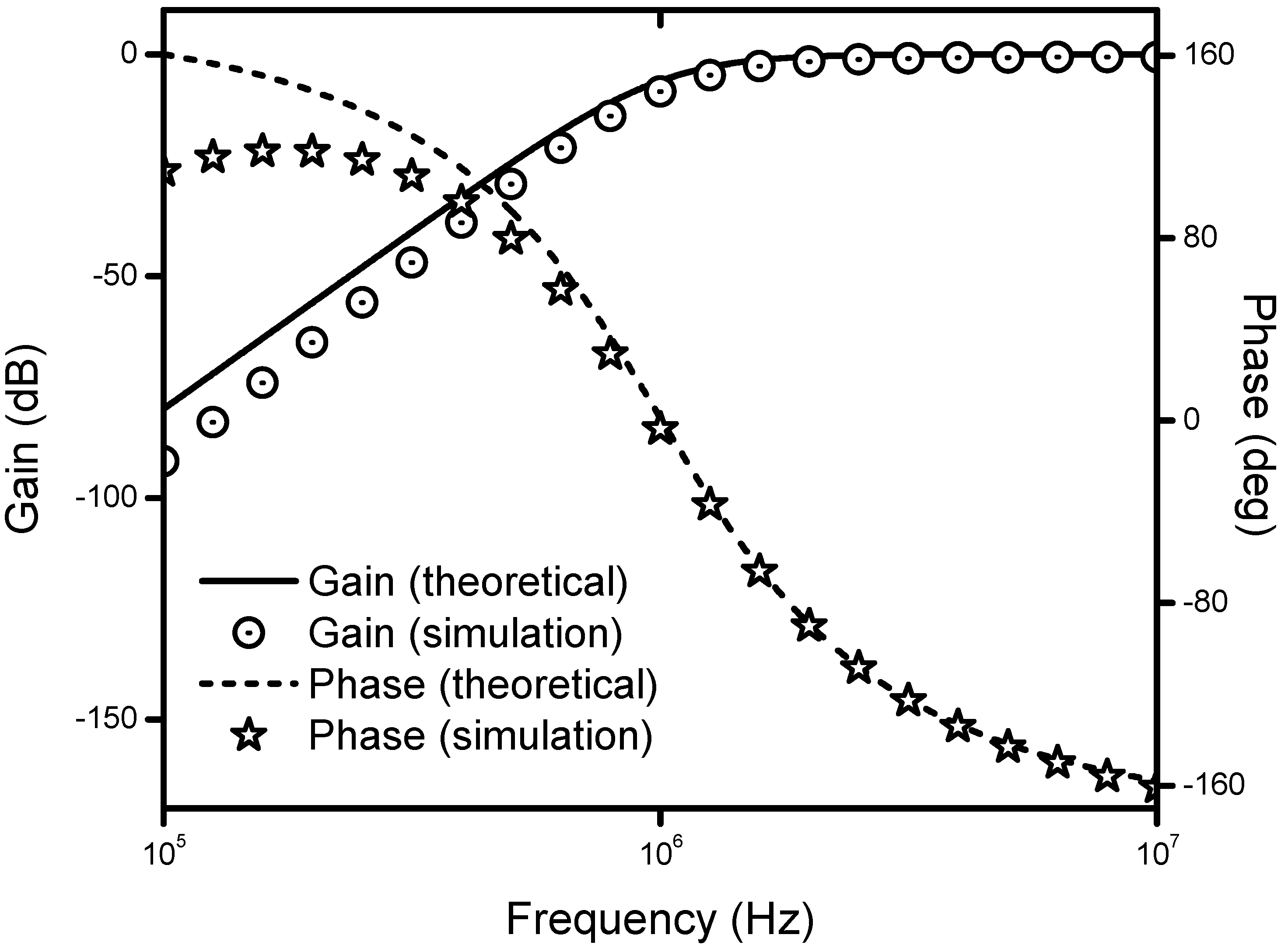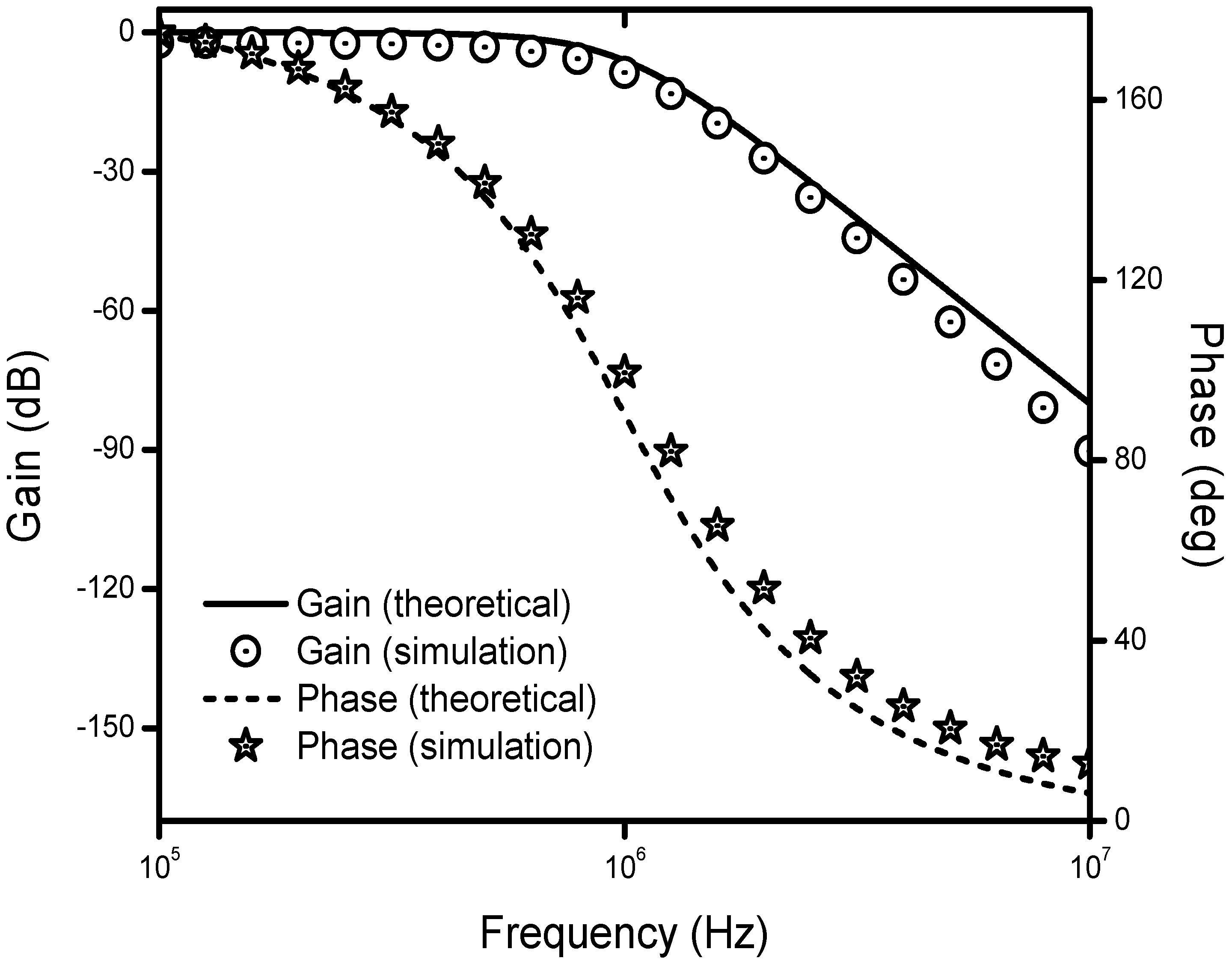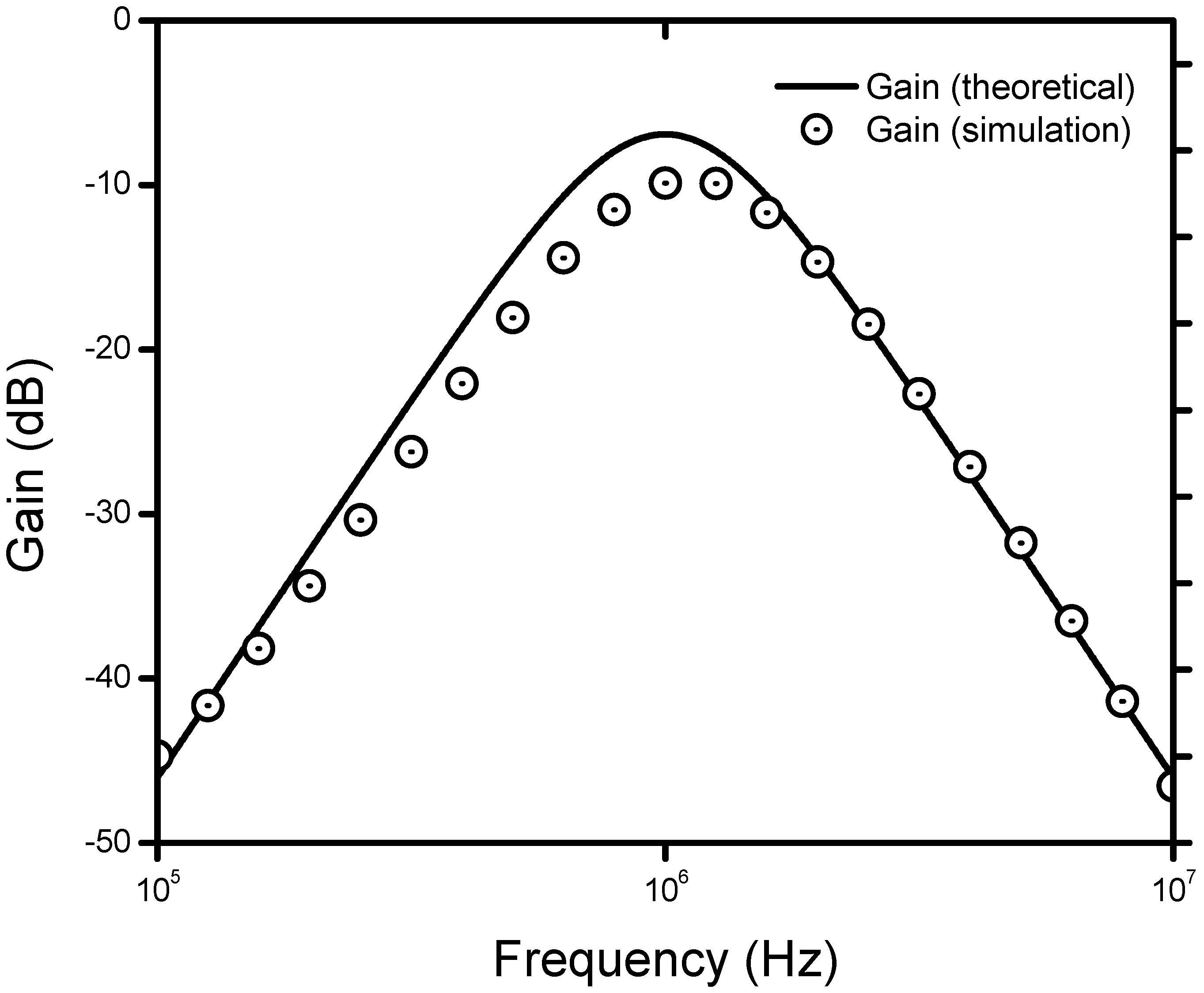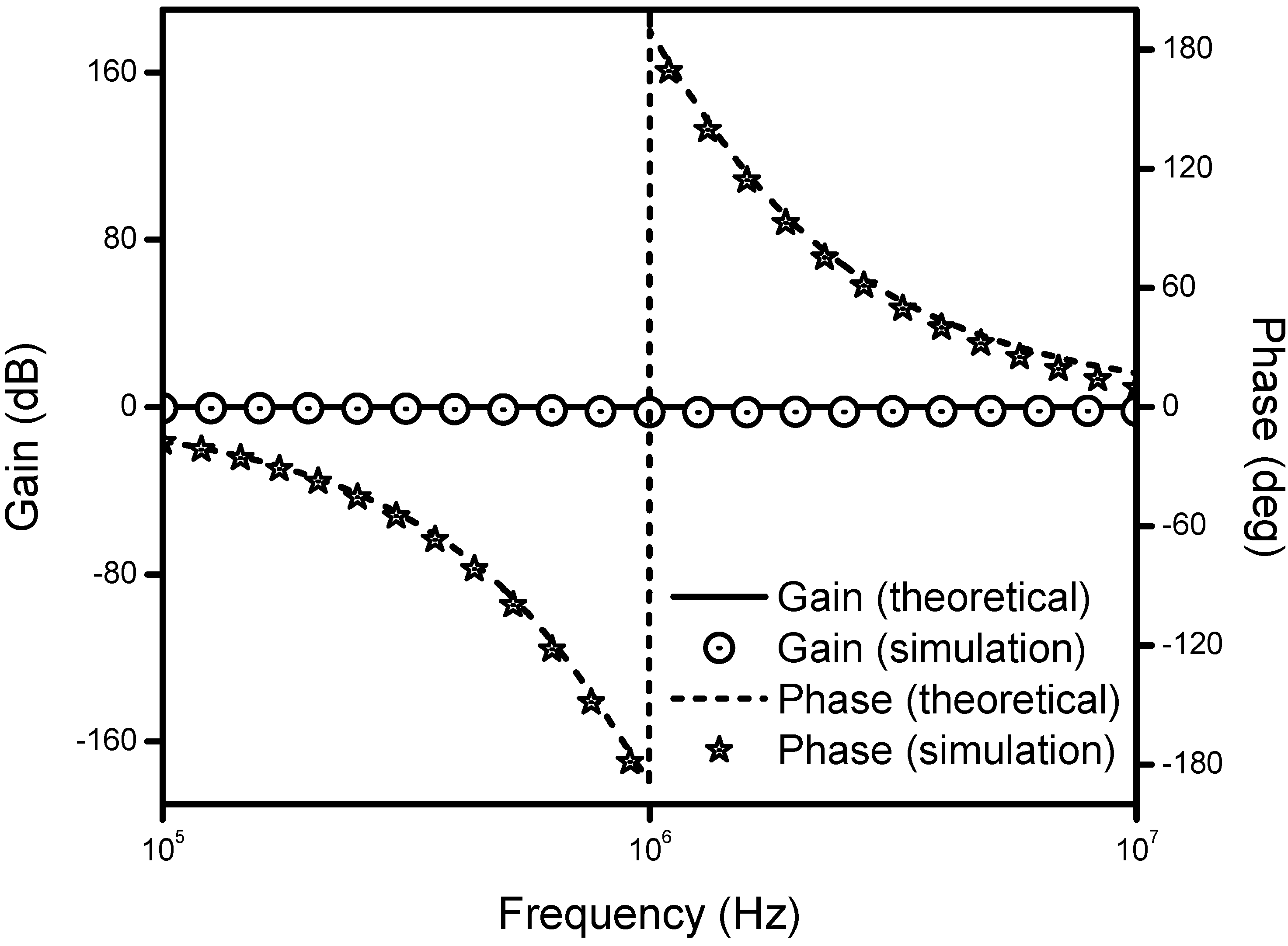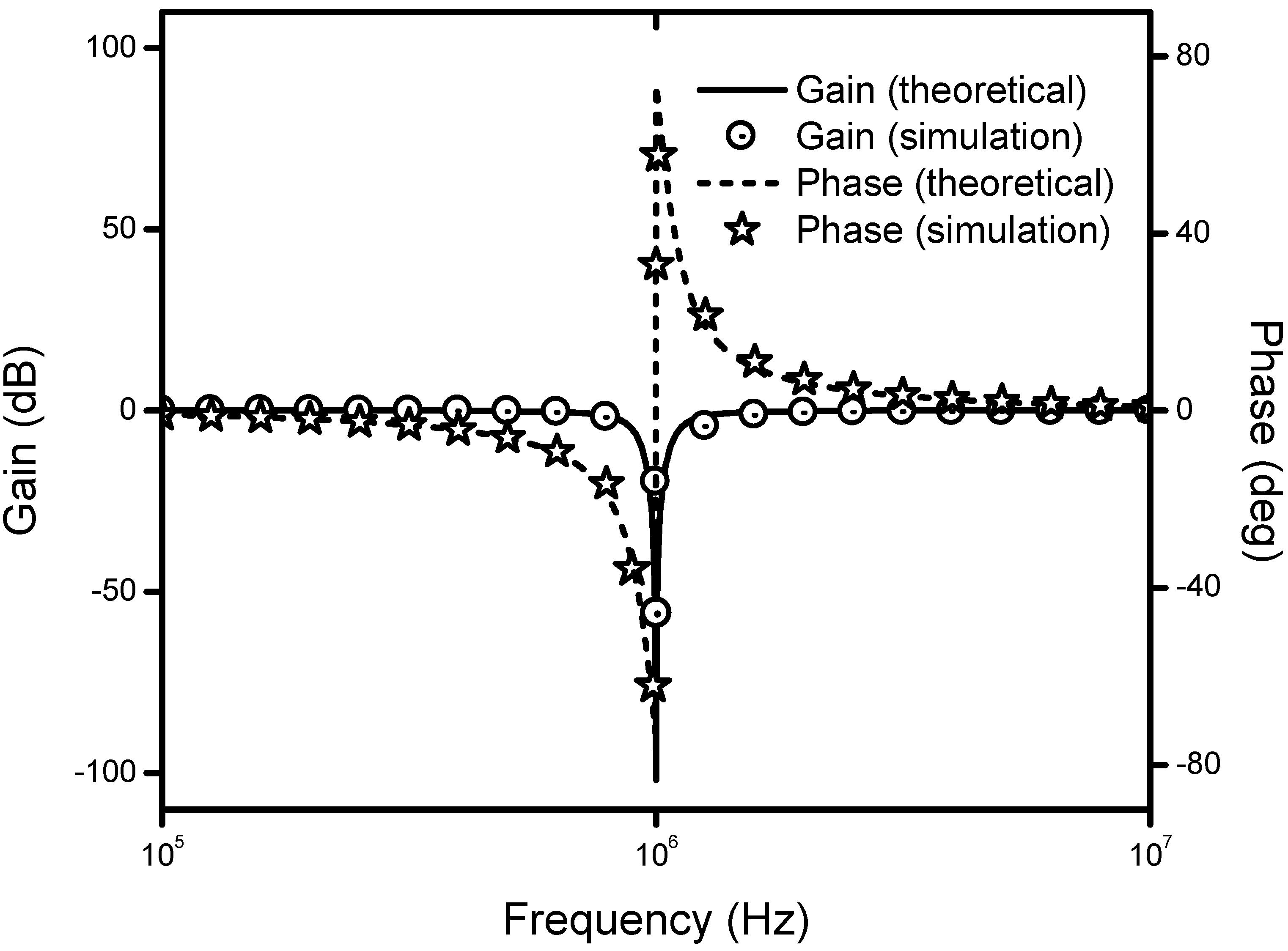 We simulated the filters in Figure 5f (type-A) and Figure 7b (type-B) for illustration. The values of capacitors are chosen as C1 = C2 = 10 pF for all simulations. The values of resistors are given by R1 = 11.26 kΩ and R2 = R3 = 15.92 kΩ for the simulations of lowpass, bandpass and highpass filters. Figure 9 and Figure 10 show the lowpass and bandpass responses at Vout1 and Vout2 of the filter in Figure 5f with node Vin3 as input node and nodes Vin1, Vin2, and Vin4 being ground node. The frequency responses of highpass output in Figure 5f with node Vin1 as input node and nodes Vin2, Vin3, and Vin4 being grounded is shown in Figure 11. Figure 12 shows the notch responses at Vout1 of the circuit in Figure 7b, with the merged node of Vin1 and Vin5 as input node and nodes Vin2, Vin3 and Vin4 being ground node, and R1 = 79.62 kΩ, R2 = R2 = R3 = 15.92 kΩ. Figure 13 represents the frequency responses of the allpass function in Figure 7b with the merged node of Vin1, Vin4, and Vin5 as input node and Vin2 and Vin3 grounded. The R1 = R2 = 11.26 kΩ and R3 = 22.52 kΩ is used. All the simulated results are consistent with our theoretical prediction. The workability of the synthesized filters is verified.