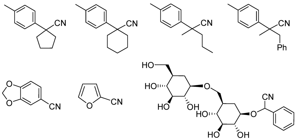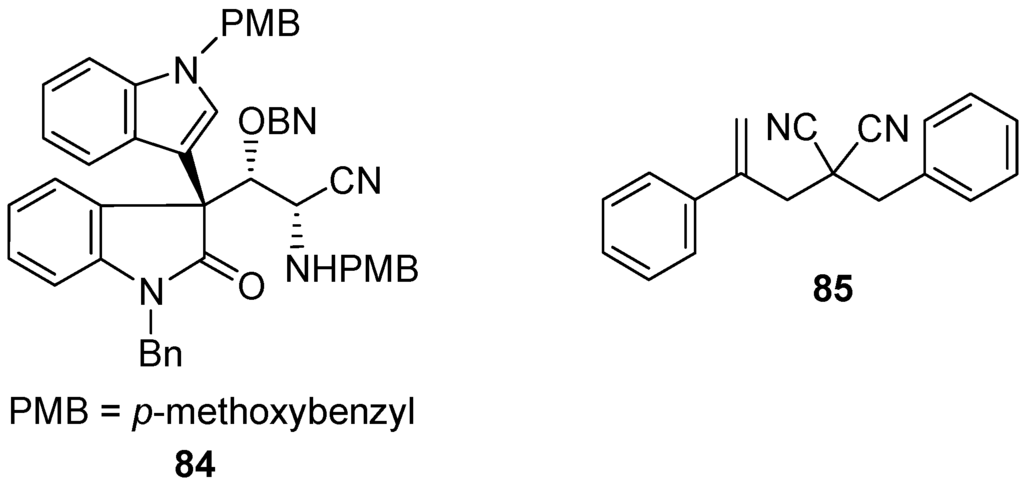 In addition to cyanohydrins, other nitriles mentioned in the literature for which complex [PtH{(PMe2O)2H}(PMe2OH)] (1) proved ineffective were 84 and 85 (Figure 6). In the case of 84, the treatment with 1 in an EtOH/H2O mixture at 70 °C resulted in the decyanation of the substrate and generation of the corresponding aldimine [92]. For the malonodinitrile 85, although its monohydration using 1 was possible, the reaction yield was very low in comparison to that achieved employing the more classical KF-Al2O3 system [93].
