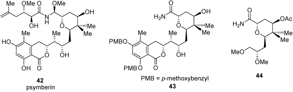 - Rech, J.C.; Floreancig, P.E. Concise and stereoselective synthesis of the N7-C25 fragment of psymberin. Org. Lett. 2005, 7, 5175–5178. [Google Scholar] [CrossRef] [PubMed]