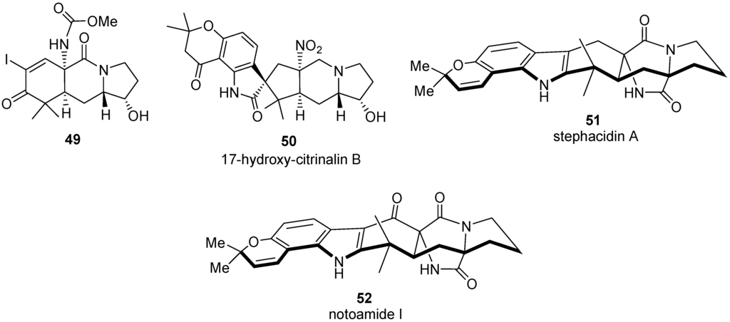 In an independent work, Sarpong and co-workers reported the preparation of the related 17-hydroxy-citrinalin B (50), as well as those of the alkaloids stephacidin A (51) and notoamide I (52), using carbamate 49 as a common intermediate (Figure 4) [61]. As in the previous case, formation of 49 was accomplished through a hydration/Hofmann rearrangement sequence from the corresponding nitrile, the hydration step being again promoted by the Parkins platinum catalyst 1.