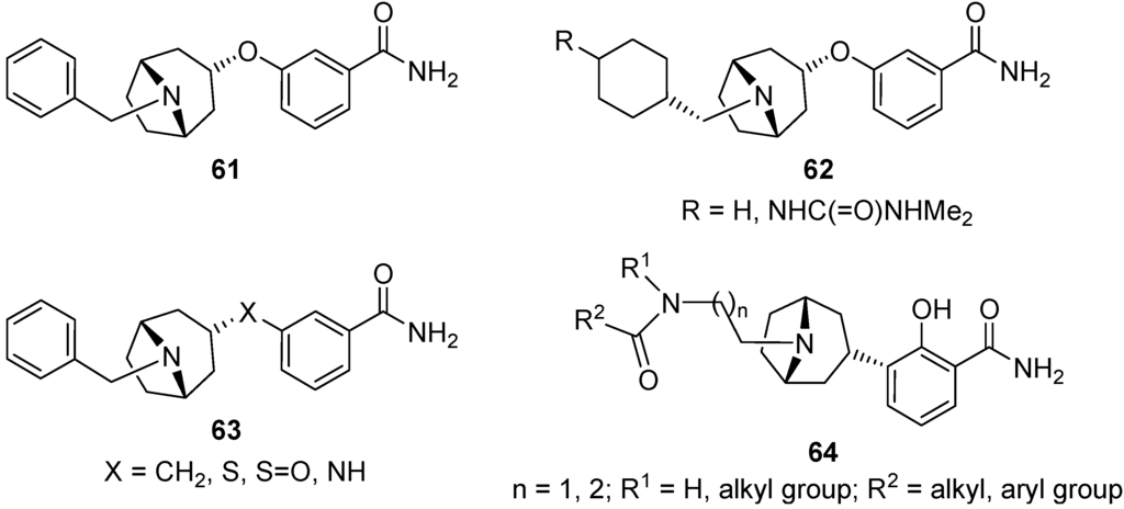 Antagonists of the kappa opioid receptor have great therapeutic potential for the treatment of a range of central nervous system diseases and disorders, including, for example, schizophrenia, depression, and anxiety [68,69,70]. Quite recently, 8-azabicyclo[3.2.1]octan-3-yloxy-benzamides, as exemplified by 61 in Figure 5, were identified by Brugel and co-workers as potent and selective kappa opioid receptor antagonists [71]. In an additional SAR study, the same authors synthesized a large number of related compounds, such as 62 and 63, in which the benzamide unit was generated by hydration of the corresponding nitrile with the Parkins catalyst [72]. Reactions were performed in an EtOH/water (6:1 v/v) mixture at 80 °C, but no details on the yields, metal loadings, and reaction times were given in the document. The preparation of the structurally related azabicyclooctane derivatives 64 using 1 was also described, and their receptor binding affinity for kappa, mu, and delta opioid receptors was evaluated [73].