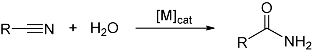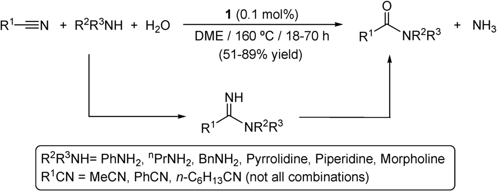 The selective transformation of a functional group within a complex molecule to generate target compounds is a very important issue in organic synthesis. Although this is not a trivial task, the use of homogeneous metal catalysts allows, in many cases, to reach compounds with remarkable levels of selectivity. Indeed, the field of homogeneous catalysis is currently so widespread that, in the literature, it is difficult to find advanced syntheses not using metal catalysts at some stage [1,2,3]. One of the organic transformations in which metal catalysts have played a key role is the hydration of nitriles (Scheme 1), a process of great relevance in view of the broad industrial, synthetic, biological, and pharmacological applications of corresponding primary amide products [4,5,6].
