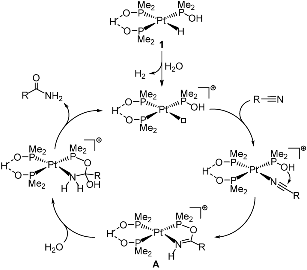 Then, an intramolecular nucleophilic attack of the OH group of the PMe2OH ligand on the coordinated nitrile takes place, affording the five-membered metallacyclic intermediate A. Further hydrolysis of this metallacycle generates the amide product and regenerates the active platinum species [16,17,18].