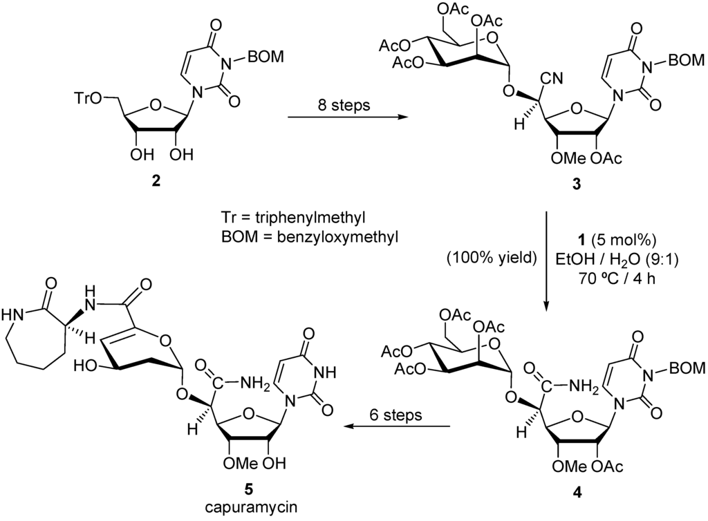 Capuramycin (5), a nucleoside antibiotic isolated from the culture filtrate of Streptomyces griseus 446-S3 [22], and its congeners are considered to be important lead molecules for the development of new drugs for Mycobacterium tuberculosis infections [23]. Accordingly, remarkable efforts have been devoted to establish convergent synthetic routes to access 5 that allow the preparation of analogues for SAR (structure-activity relationship) studies [24]. In this context, in 2009, Kurosu and co-workers described a concise synthesis of capuramycin (5), starting from the partially protected uridine 2 (15 steps), in which the primary amide unit was conveniently generated by the hydration of the C≡N unit of intermediate 3 using [PtH{(PMe2O)2H}(PMe2OH)] (1) (Scheme 3) [25]. The hydration reaction, performed in aqueous ethanol at 70 °C, with 5 mol% of 1, allowed the quantitative conversion of 3 to the corresponding amide 4.
