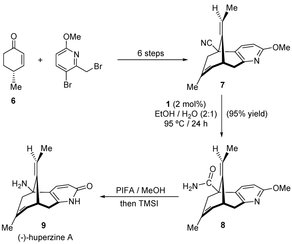 (−)-Huperzine A (9) is a tricyclic alkaloid produced by the Chinese herb Hupercia serrata [26], with intense contemporary interest in clinical application for treating neurodegenerative diseases [27,28,29]. Several total syntheses of 9 have been reported [27,28,29]. In one of the most recent and scalable (eight steps starting from (R)-4-methyl-cyclohex-2-ene-1-one (6); 35%–45% overall yield), complex 1 was employed to promote the high-yield conversion of advanced nitrile intermediate 7 into amide 8 in aqueous ethanol (Scheme 4) [30]. From 8, Hoffmann's rearrangement of the amide group by means of [bis(trifluoroacetoxy)iodo]benzene (PIFA), followed by in situ deprotection of the pyridone unit with iodotrimethylsilane (TMSI), delivered the desired alkaloid.