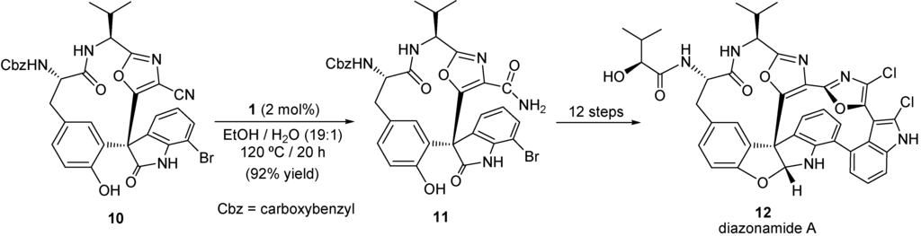 The selective hydration of nitrile 10 to generate primary amide 11, an advanced intermediate for the Nicolaou’s synthesis of the marine natural product diazonamide A (12) [31,32], using [PtH{(PMe2O)2H}(PMe2OH)] (1) was described by Sammakia and co-workers (Scheme 5) [33]. The reaction proceeded cleanly in aqueous ethanol at 120 °C with a catalyst loading of only 2 mol%, delivering 11 in 92% isolated yield.