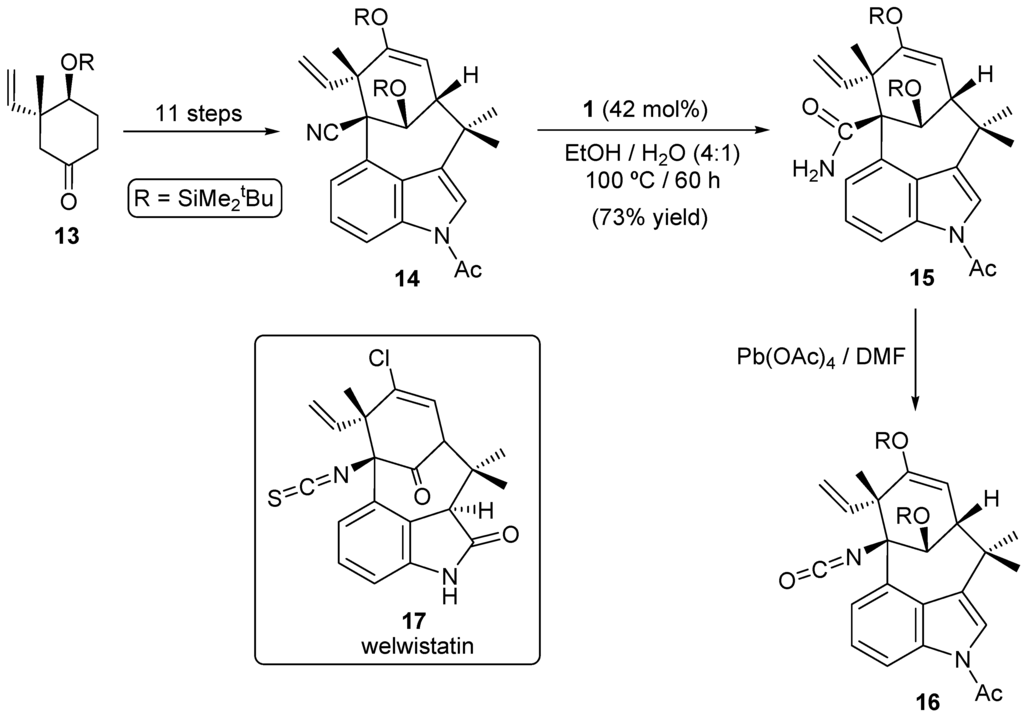 The welwitindolinones are a fascinating group of structurally unique metabolites isolated from blue-green algae that contain 3,4-bridged or spiro-cyclobutaneoxindole moieties [34,35]. Due to their challenging structures and their broad spectrum of biological activities, these compounds have attracted the attention of synthetic chemists for some time, although their complexity has prevented the completion of total syntheses for most of them thus far [36]. In an approach to welwitindolinone C isothiocyanate (welwistatin 17), Funk and co-workers have described the preparation of the related indole isocyanate derivative 16 starting from the vinylcyclohexanone 13 after 13 steps (Scheme 6) [37]. In this synthesis, the Parkins catalyst was employed to hydrate the encumbered nitrile 14. A high loading of complex 1 (42 mol%) was, in this case, required to generate the bridgehead primary amide 15 in high yield (73%). In the presence of Pb(OAc)4, amide 15 evolved into the final isocyanate 16 through the Baumgarten variant of the Hoffmann rearrangement.