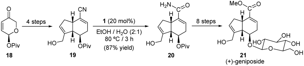 In 2009, Jones and Krische developed a total synthesis of (+)-geniposide (21), an iridoid β-glucoside of natural origin with anti-tumor and anti-inflammatory activity, starting from pivalate-protected lactol 18 (Scheme 7) [38]. During this synthesis the conversion of nitrile intermediate 19 into amide 20 was successfully accomplished in 87% yield using 20 mol% of the platinum complex [PtH{(PMe2O)2H}(PMe2OH)] (1).