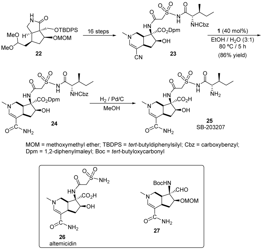 SB-203207 (25), an alkaloid isolated from a Streptomices species by researchers in the SmithKline Beecham group, was found to show marked isoleucyl tRNA synthetase inhibition activity [39,40]. Very recently, Kan and co-workers described a total synthesis of this compound starting from lactam 22, in which the primary amide unit was generated by catalytic hydration of nitrile intermediate 23 with complex 1 (Scheme 8) [41]. As in the two previous cases, a high loading of 1 was needed to obtain the corresponding amide product 24 in high yield. SB-203207 can also be accessed by acylation of the sulfonamide unit of naturally occurring altemicidin (26 in Scheme 8) [42]. In this context, the stereoselective synthesis of a key intermediate for altemicidin, i.e. amide 27 (see Scheme 8), was accomplished by Kan and Fukuyama employing [PtH{(PMe2O)2H}(PMe2OH)] (1) [43]. Compound 27 was obtained in quantitative yield by the hydration of the corresponding nitrile in aqueous ethanol at 75 °C for 12 h with 28 mol% of 1.