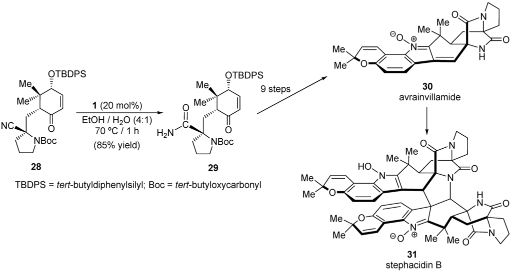 In a synthetic approach toward the cytotoxic indole alkaloid avrainvillamide (30) and its dimeric form stephacidin B (31) [44], Myers and co-workers used [PtH{(PMe2O)2H}(PMe2OH)] (1) to synthesize primary amide intermediate 29 by the hydration of nitrile 28 (Scheme 9) [45,46]. The reaction proceeded cleanly in aqueous ethanol at 70 °C and with 20 mol% of 1, affording 29 in 85% isolated yield.