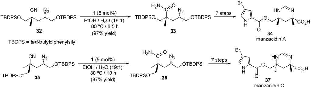 The manzacidins are a family of marine natural products featuring a tetrahydropyrimidine carboxylic acid and an ester-linked bromopyrrole unit. This class of alkaloids has attracted significant attention due to their biological activities and unusual structure. Consequently, many groups have described the enantio- and diastereoselective synthesis of some of them [47]. In this context, Deng and co-workers reported synthetic routes to manzacidin A (34) [48,49] and manzacidin C (37) [50] involving a nitrile hydration step promoted by complex [PtH{(PMe2O)2H}(PMe2OH)] (1) (Scheme 10). In particular, 1 was used to transform the diasteromeric nitriles 32 and 35 into the corresponding primary amide intermediates 33 and 36, respectively. As shown in the scheme, almost quantitative yields were achieved in both cases, performing the reactions at 80 °C with low catalyst loading (5 mol%).
