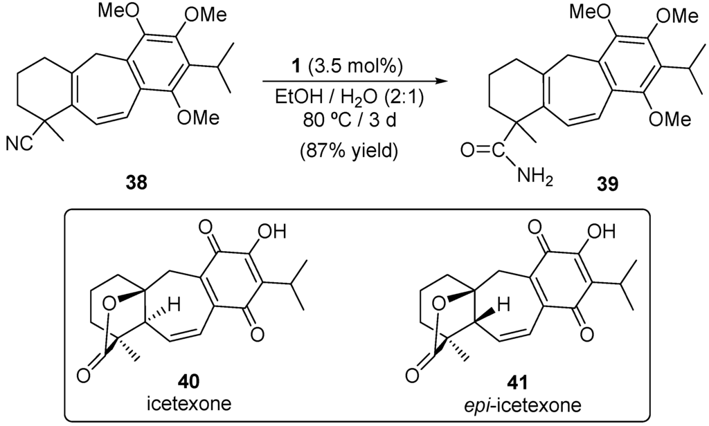 In the context of their synthetic studies on the icetaxane family of diterpenoids, the hydration of nitrile 38 by complex 1 was successfully employed by Sarpong and co-workers to prepare primary amide 39, from which the formal synthesis of icetexone (40) and epi-icetexone (41) could be completed (Scheme 11) [51,52].