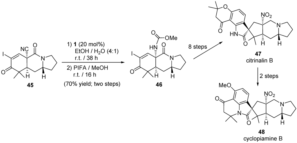 The total syntheses of the prenylated indole alkaloids citrinalin B (47) and cyclopiamine (48) has been recently accomplished for the first time by Mercado-Marin, García-Reinada, and co-workers (Scheme 12) [60]. In their work, the key carbamate intermediate 46 was generated through a two-step sequence from tricyclic nitrile 45 via initial hydration of the C≡N catalyzed by complex [PtH{(PMe2O)2H}(PMe2OH)] (1), followed by Hofmann rearrangement of the resulting carboxamide (not isolated) promoted by PIFA in MeOH.