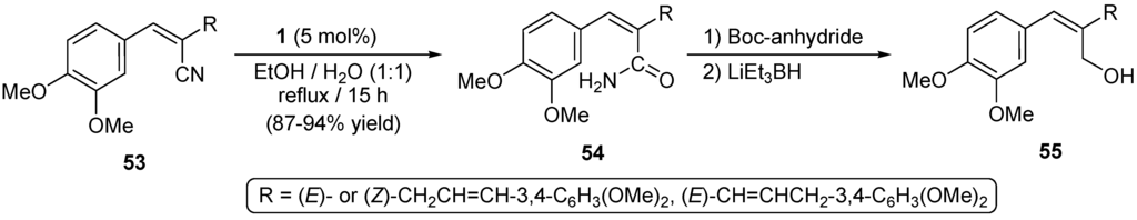 Finally, Fleming and co-workers reported the preparation of a series of morinol-type lignans 55 starting from α,β-unsaturated nitriles 53 (Scheme 13) [62]. The selective transformation of the alkenenitrile unit of 53 into the allylic alcohol one involved an initial hydration step, catalyzed by complex [PtH{(PMe2O)2H}(PMe2OH)] (1), followed by an acylation/reduction of the resulting amides 54.