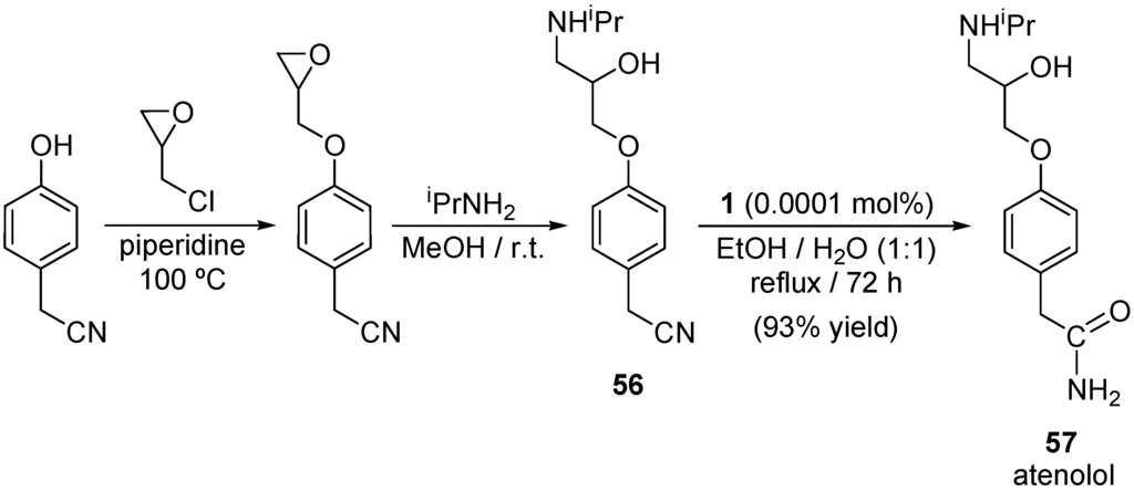 One of the first synthetic applications of complex [PtH{(PMe2O)2H}(PMe2OH)] (1) was in the preparation of atenolol (57), a drug belonging to the group of β-blockers which contains a primary amide group and is commonly employed in the treatment of hypertension [63]. In particular, 1 had no difficulty in promoting the final hydration step of the nitrile intermediate 56. Thus, as shown in Scheme 14, performing the reaction in a refluxing ethanol/water (1:1 v/v) mixture, and using a very low catalyst loading of 0.0001 mol%, atenolol could be selectively obtained in 93% yield [64].
