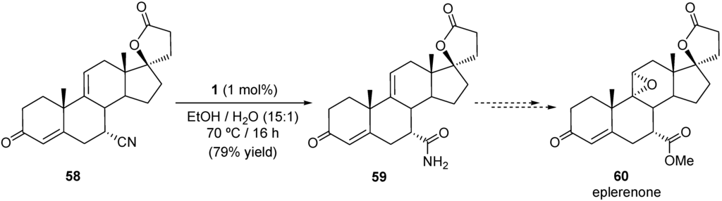 The steroidal compound eplerenone (60) is an orally-active aldosterone antagonist featuring a canrenone-type structure that is also used for the treatment of hypertension and heart failure [65,66]. The synthesis of 60 has been the subject of several patents. In one of them, the Parkins catalyst was successfully employed to transform the advanced intermediate 7α-cyano-9(11)Δ-canrenone 58 into 7α-carbamoyl-9(11)Δ-canrenone 59 (Scheme 15) [67]. Conversion of the amide unit of 59 to the corresponding carboxylic acid, followed by esterification, or direct alcoholysis of the amide to the ester, completed the synthesis of 60.