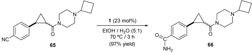 In a patented work directed to the identification of novel histamine H3 receptor ligands, Brugel and co-workers also employed complex [PtH{(PMe2O)2H}(PMe2OH)] (1) to promote the high yield conversion of the racemic cyclopropyl-substituted benzamide 65 into primary amide 66 (Scheme 16) [74]. It is of note that when the same reaction was carried out employing an excess of KOH as the promoter, 66 was obtained in a much lower yield (69% vs. 97%).