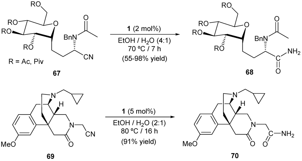 In addition, hydration with the Parkins catalyst 1 was also successfully employed to transform the acetate- and pivaloate-protected aminonitrile glycoside 67 and the morphinan derivative 69 into the corresponding primary amides 68 and 70, respectively (Scheme 17) [75,76].