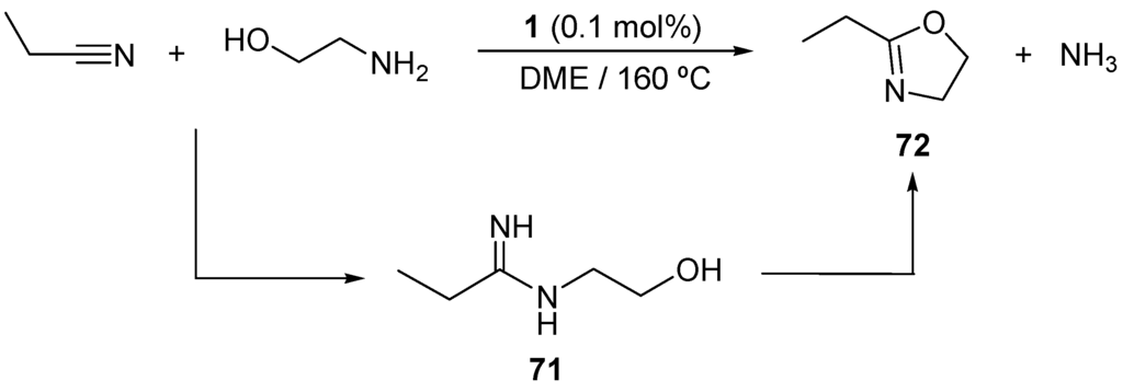 An interesting extension of this amidation process is the quantitative formation of 2-ethyl-2-oxazoline 72 from the reaction of propionitrile with 2-aminoethanol via ring-closure of the intermediate amidine 71 (Scheme 19) [77].