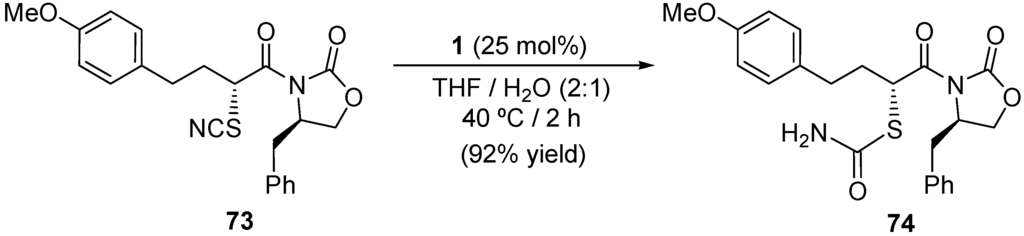 Although scarcely explored, the ability of complex 1 to promote the hydration of thiocyanates was also demonstrated [78,79]. As a representative example, treatment of the optically active thiocyanate 73 with 25 mol% of 1 in a THF/H2O mixture led to the high-yield formation of thiocarbamate 74 (Scheme 20). Remarkably, in marked contrast with the use of classical acidic hydrolysis conditions, which induced the complete racemization at the stereogenic carbonyl α-carbon, the reaction proceeded without loss of chirality.