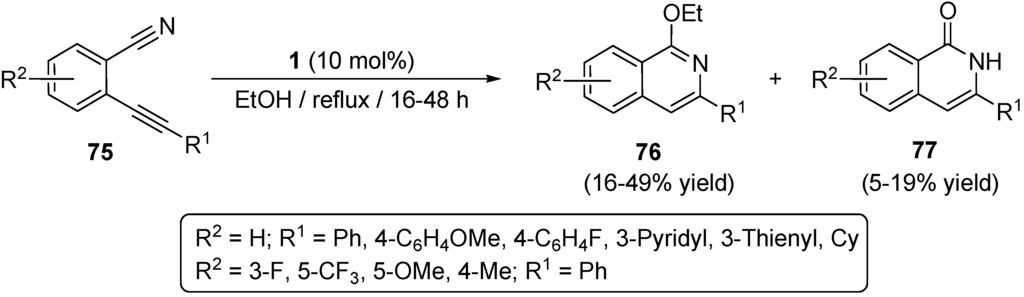 On the other hand, in the presence of catalytic amounts of [PtH{(PMe2O)2H}(PMe2OH)] (1), separable mixtures of 1-ethoxyisoquinolines 76 and isoquinolones 77 were synthesized by intramolecular 6-endo-dig cyclization of ortho-alkynylbenzonitriles 75 in ethanol (Scheme 21) [80]. In these reactions the Parkins catalyst activates not only the nitrile unit, but also the alkyne moiety of the substrates. The use of other alcohols, such as methanol, iso-propanol, or cyclopentanol, also led to mixtures of the corresponding 1-alkoxyisoquinolines and isoquinolones 77.