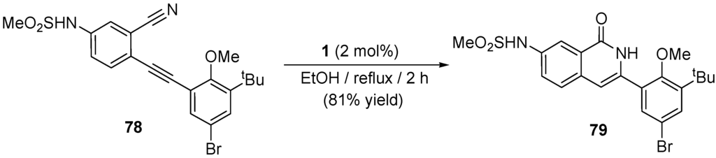 In an independent patented work, a more selective transformation of ortho-alkynylbenzonitrile 78 was observed [81]. Thus, as shown in Scheme 22, the treatment of this substrate with 2 mol% of platinum complex 1 in refluxing methanol resulted in the exclusive formation of isoquinolone 79.