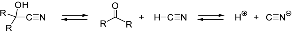 Equilibrium between a cyanohydrin and the corresponding aldehyde/ketone and hydrogen cyanide.