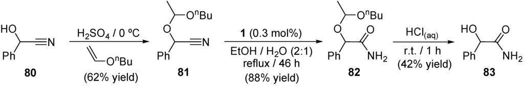 Although with only one example, Parkins and co-workers showed that this limitation can be circumvented, protecting the OH group of the cyanohydrin prior to the hydration reaction [90]. Thus, as shown in Scheme 24, mandelamide (83) was accessible from mandelonitrile (80) by the hydration of the corresponding mixed acetal 81 and the subsequent removal of the α-butoxyethoxy protecting group in the resulting amide 82 with dilute acid. In this context, we must also stress that the ability of complex 1 to promote the selective conversion of cyanohydrin acetates into α-acetoxy amides has also been demonstrated [91].