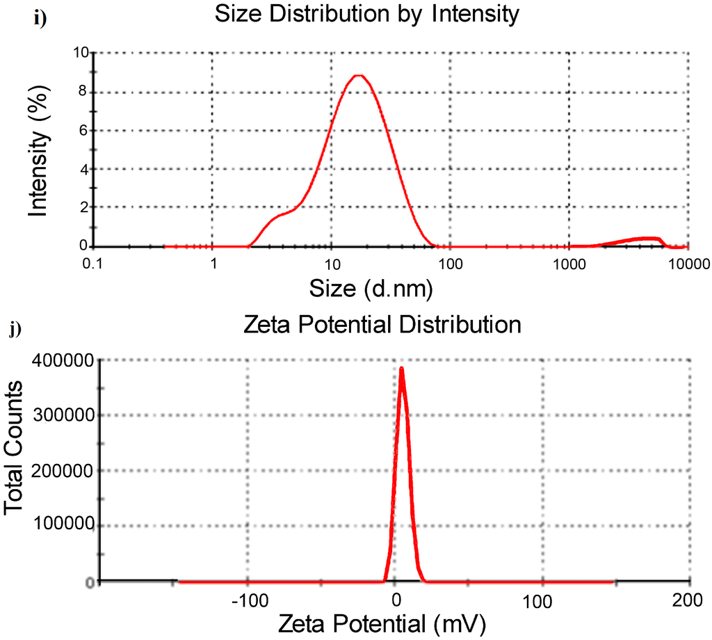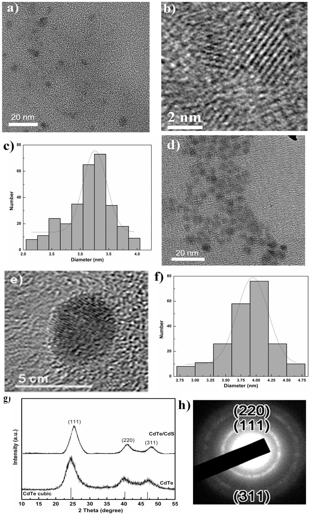 (a) Transmission electron microscopy (TEM) and (b) high-resolution (HR)-TEM images of CdTe QDs; (c) size distribution analysis of CdTe quantum dots (QDs); (d) TEM and (e) HR-TEM of dendrimer modified CdTe/CdS QDs; (f) size distribution analysis of dendrimer modified CdTe/CdS QDs; (g) X-ray powder diffraction (XRD) diffraction patterns of CdTe QDs and dendrimer modified CdTe/CdS QDs; (h) Selected area electron diffraction (SAED) pattern of dendrimer modified CdTe/CdS QDs; (i) zeta potential and (j) hydro diameter distribution of freshly prepared QDs.