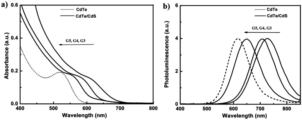As shown in Figure 2a, in the UV-vis absorption spectrum, there is a blue shift of the absorption band as the generation of the dendrimer is increased. The absorption shift that is observed for the different generations of dendrimers confirms that the amine groups are participating with dendrimers in the capping of the QDs. In the PL spectrum, the CdTe QDs exhibited emission at 562 nm with the excitation wavelength set of 365 nm. Compared to CdTe QDs, the emission wavelength of dendrimer modified core/shell CdTe/CdS QDs shifted to 650 nm which has been taken as a feature of QDs with spatial separated charge carriers [12]. Furthermore, the excitoinc peak of the core/shell CdTe/CdS QDs shifted to shorter wavelength companying with increasing the generations of dendrimers. This phenomenon of blue shift in emission peak is consistent with the known theory of quantum size effects.