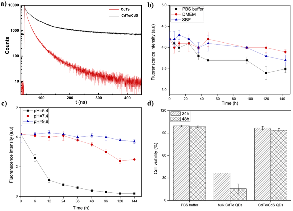 In order to develop a stable PL signal for the biological applications, the fluorescence stability of dendrimer modified CdTe/CdS QDs was accessed under various tested conditions such as pH, buffer solution and incubation time, respectively. As shown in Figure 3b, the PL signal of dendrimer-CdTe/CdS QDs is more stable when they were stored in Dulbecco’s modified eagle medium (DMEM) and stimulate body fluid (SBF) buffer compared with they were stored in PBS buffer. Particularly, the fluorescence intensity of dendrimer modified CdTe/CdS QDs remains at 88% of the initial value after storage for 144 h in the PBS buffer. However, exposure of the QDs solutions to the acidic condition resulted in a decreased PL intensity, but it was basically stable under either neutral condition or alkaline condition (Figure 3c). This phenomenon is attributed to the surface charge characteristics of dendrimer modified QDs [14].